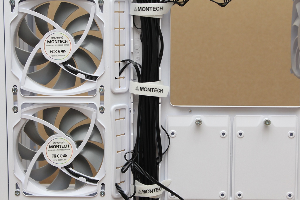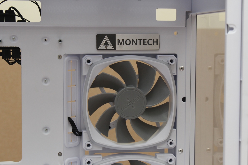 主机板右侧有君主MONTECH铭版与Logo, 还可以安装两颗120mm风扇与240mm水冷排,已内建两颗RX120 ARGB反叶风扇