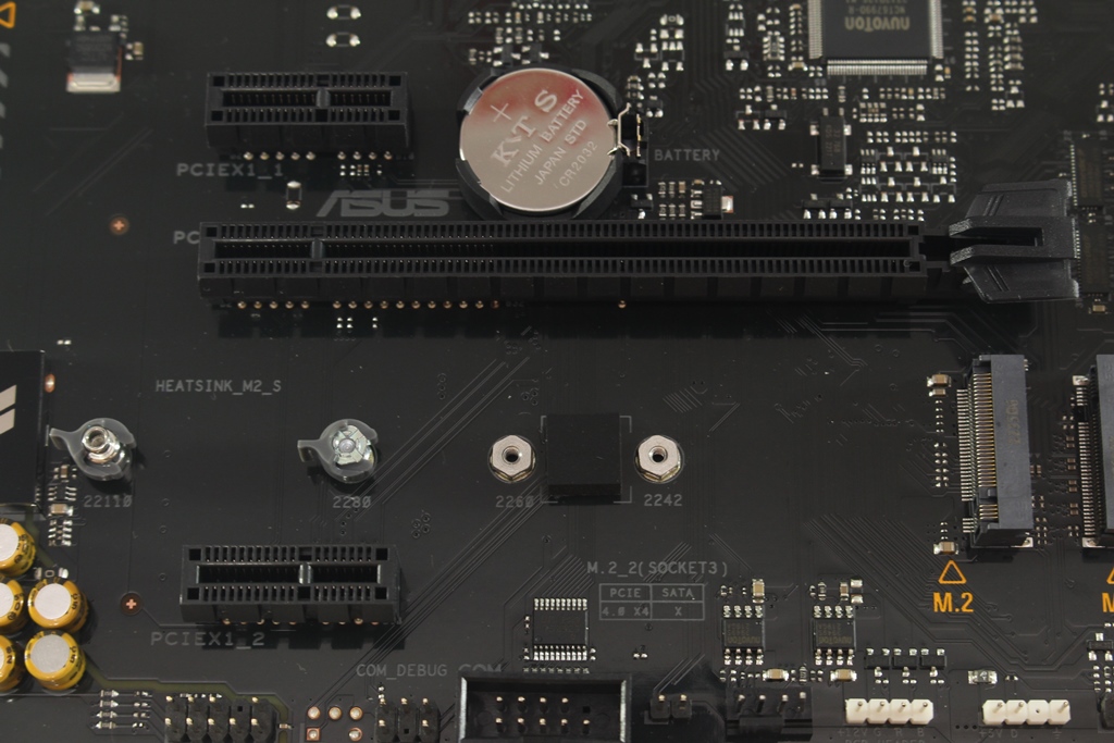 ▼第二组与第三组M.2提供PCIe Gen4 x4讯号,共用一片全覆盖式散热片,最大长度分别支持到22110与2280