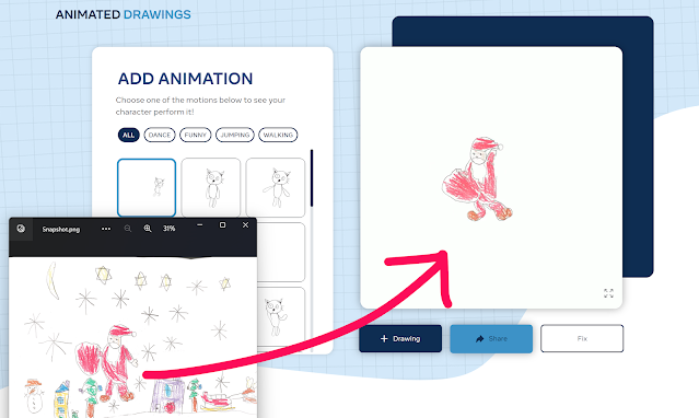 而且这个「Animated Drawings」线上服务非常自动化,只要上传小孩的涂鸦图画,他就会自动侦测人物,自动加上动画节点,我们只要选择人物想做的各种好玩的动作,系统就会帮我们快速生成动画视频。