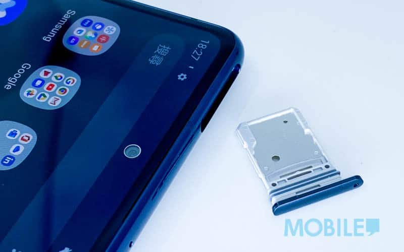 机身扩充部份,Galaxy S20 FE跟其他S20系列手机一样、未具备3.5mm耳机端子,但就保留了立体声扬声器、对应Dolby Atmos声效及支持自家Samsung Scalable编码。 从未置有按键的机身左侧可以看到,因改用平面屏幕关系,边框较原版圆润,另外S20 FE的扩充卡槽虽改为两面插卡设计,但仍然支持 Micro SD 内存卡。