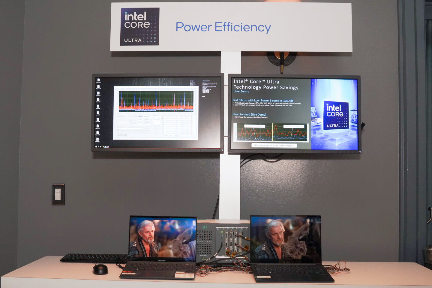 ▲ Intel在活动现场以2台规格接近的笔记本电脑搭配专业仪器测量播放4K视频时,处理器消耗的电力。