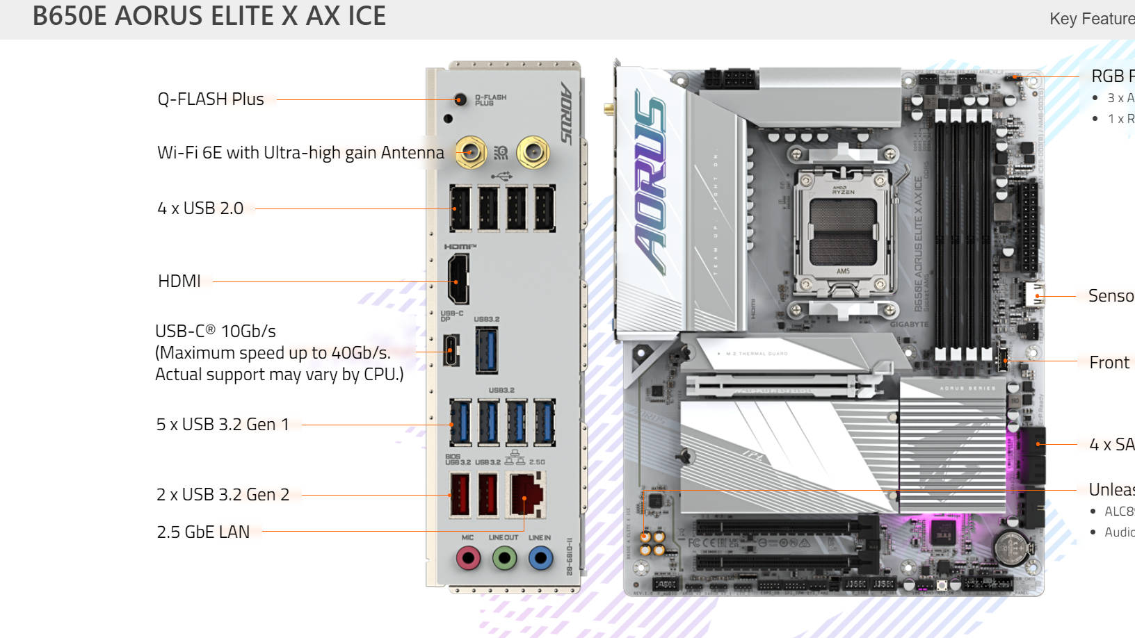 由技嘉提供的官方信息可看到,B650E AORUS ELITE X AX ICE将支持1个40 Gbps的USB TYPE-C,而该USB TYPE-C由CPU提供。 从完整的BLOCK DIAGRAM可看到那个40 Gbps的USB TYPE-C应该是未有占用任何 PCI-E 通道,包括 APU 仍然支持 2 组 M.2 插槽。 笔者也没有发现说明书里有提到USB4 40 Gbps在使用上有可能出现冲突的情况,甚至没有提及是什么CPU/APU才支持USB4 40 Gbps,但留下一句MAY VARY BY CPU。