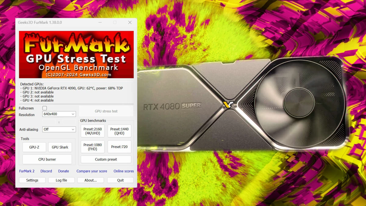FurMark 软件是一款免费的 GPU 压力测试工具,可用于突破显卡的功率和热量限制。 FurMark 测试不能取代游戏基准测试,但它可以帮助找出散热问题,或成为超频期间的有用工具。 最新1.38版本已支持RTX 40 SUPER系列显卡:RTX 4080 SUPER、RTX 4070 TiSUPER和RTX 4070 SUPER,以及Radeon RX 7600 XT。