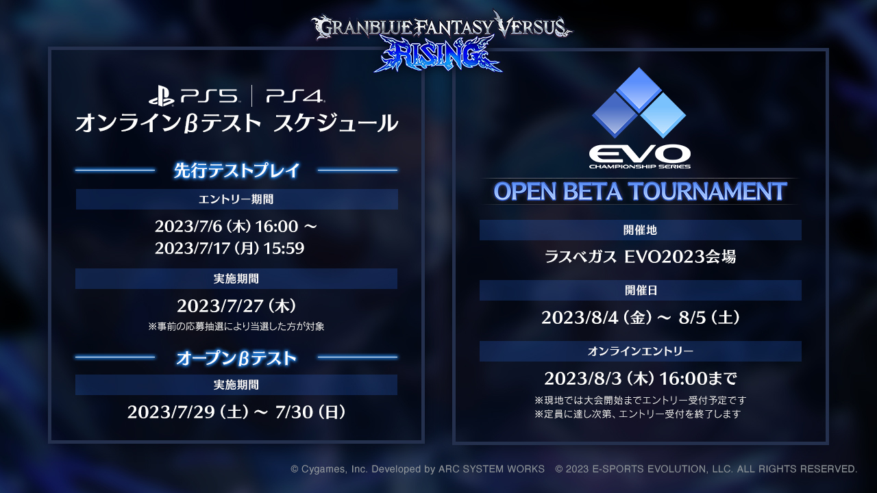 CYGAMES 旗下格斗游戏《碧蓝幻想 VERSUS》加强版《碧蓝幻想 VERSUS RISING》此前因在线模式游玩存在稳定性的问题,决定推迟 PS4 & PS5 平台的测试活动。而在近日,官方公布了全新日期,确定于 7 月 27 日展开抢先测试(7 月 6 日至 17 日抽签获得)、紧接着 7 月 29 日至 30 日期间公开给所有 PS4 & PS5 玩家参与。