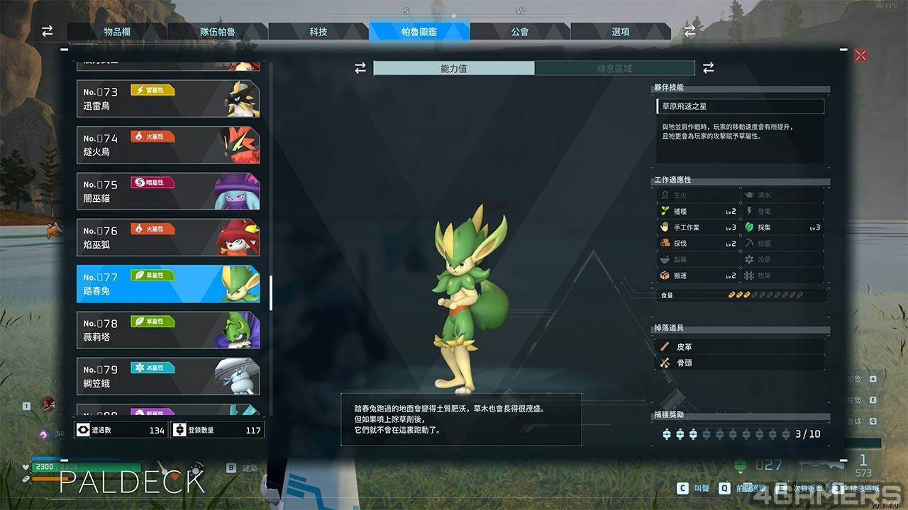 踏春兔有采集和手工作业 3 级,是相当优秀的工作帕鲁,野外有 35 等的 BOSS 可以抓,也可以用相当简单的配种公式棉悠悠+企丸王获取。