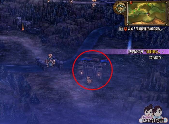接着会看到一个堡垒,前面有只小猫,到附近时会触发任务「沼地魔女」,接着和小猫对话。