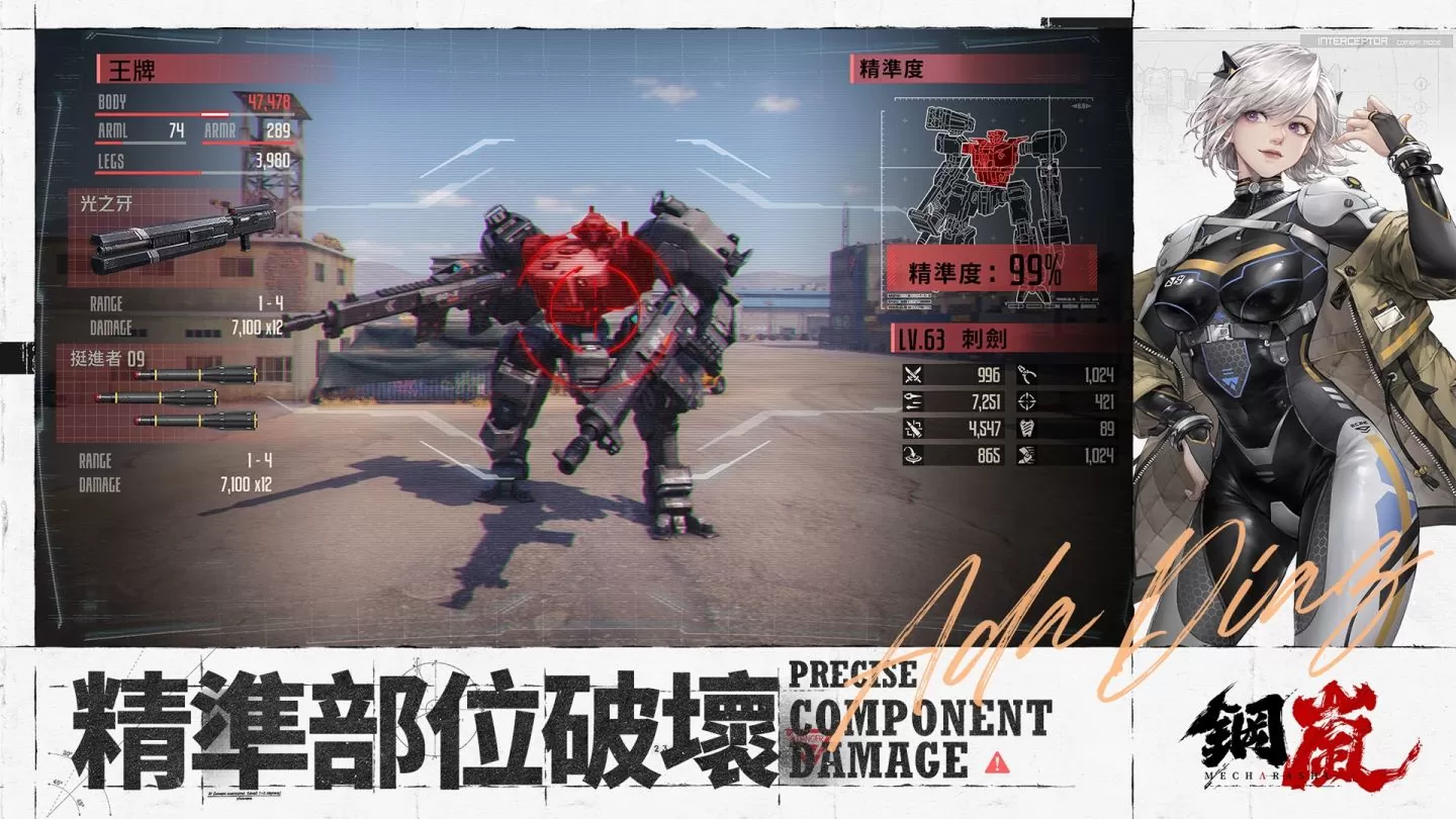 摆脱过往战棋游戏中常见的「属性克制」机制,转而强调不同机师的职业特性以及个性化的策略布局,《钢岚》的核心特色除了部位破坏玩法,可以针对右臂、左臂、躯干以及双腿进行瞄准击破,限缩敌方的武器使用能力以及闪避机动性之外,还加入了命中率的不定因素,增加了对战的刺激感,也能随着战斗的条件和职业差异,进行攻击威力预测以及行动点的配置。