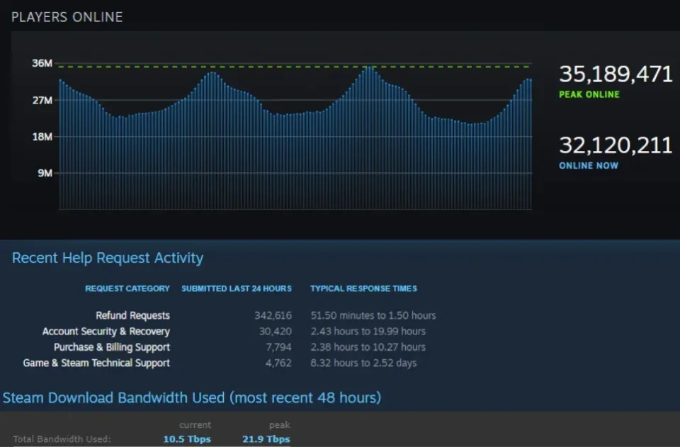 由于 Steam 平台有完善的游戏退款条例,就有玩家猜测 Steam 绝大部分的客服问题应该是针对购买游戏的退款处理,因为只要玩家符合退款资格,系统通常能在一星期内自动完成整个退款流程,效率可说是非常快速。 不过也有玩家提到,就算其中90%客服案件量都是退款问题,那还是有近三万多账号安全问题需要处理,一想到Steam客服团队几乎每天都要处理那么多案件,网友们表示能感受到Steaam客服的辛苦之处。