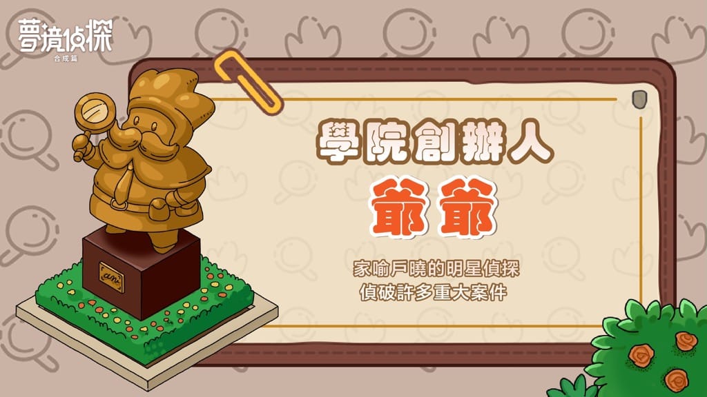 - 说明:妮妮的爷爷,是这座侦探学院的创办人,以超茂密的八字鬍闻名。 据说,爷爷在年轻时是名家喻户晓的明星侦探,曾协助警方破获多起重大案件,因此与警界高层有很深交情。 在结婚生子后退居二线,转而创办了侦探学院,希望可以培育侦探的人才,并持续为侦探界和警界提供必要的协助。 然而,因为某个惊天新闻,这名大侦探不得不离开学院,渐渐地淡出人们的视野。 有人说他回老家了,也有人说他被卷入一件神秘案件之中。 究竟爷爷的下落如何? 又为何要寄加密的信件给妮妮呢? 话说回来…… 信件是爷爷本人寄的吗?
