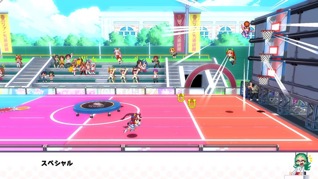 由特雷森学园主办的粉丝大感谢祭之特别活动,选手们采团体战进行「大障碍赛」、「篮球」、「躲避球」、「大胃王」四种喧闹项目。 各项目将由代表赛马娘分别出场,以拿下胜利为目标。 操控点阵风格的熟悉角色奋斗到最后一刻吧。