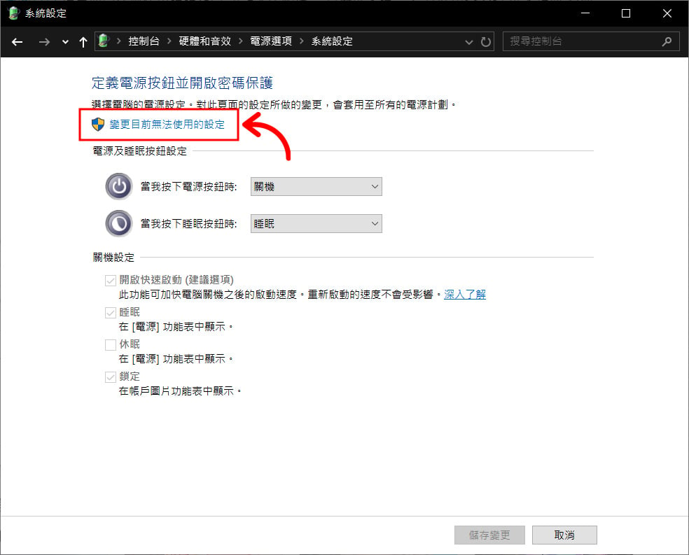 ▼ 下方的关机设置呈现灰色时,要先点击一下「变更当前无法使用的配置」