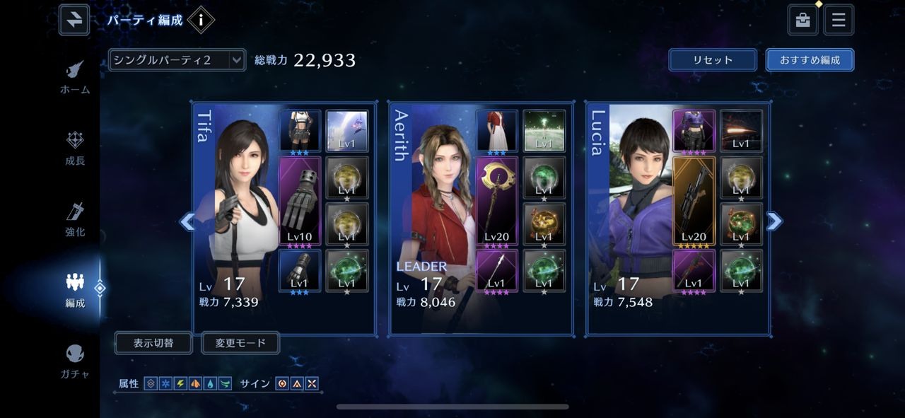 SE 的游戏养成要素都非常多,这款也不例外。 除了武器等级、魔晶石等级、角色等级、极限技等级、帐号等级以外,每个角色还有「Character Stream」这种类似星盘成长要素,新的极限技就要在这里习得。 另外,武器还有星级可以提升,每一把武器都有三星至五星能靠转蛋抽。 抽不到五星也能靠每日碎片从三星慢慢合成上去,最高可以提升到十星。