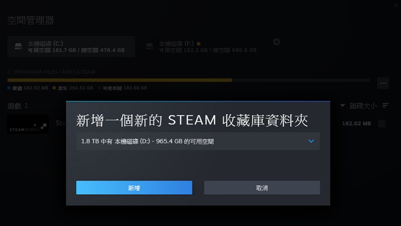 在空间管理器页面中,从现有空间右手边按+新增一个新的 Steam 收藏库文件夹,可以指定硬盘磁区还有文件夹。