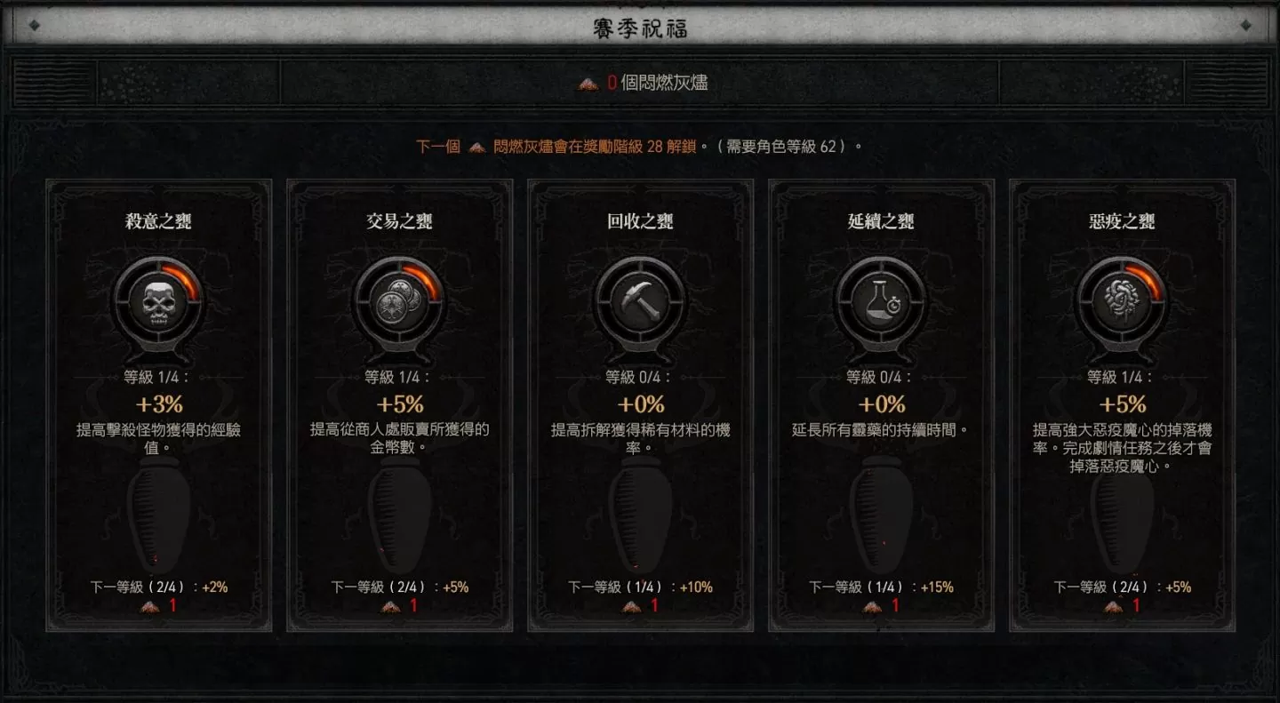 在赛季模式中,随着玩家提升战斗通行证等级,可以从中获得「闷燃灰燼」道具,并用于「赛季祝福」,放入瓮中即可让玩家在整个赛季中享有各种加成。 包括提高杀怪经验、增加贩售给商人时获得的金币数、拆解时获得稀有材料机率提升、延长灵药持续时间、提升强大恶疫魔心掉落机率。