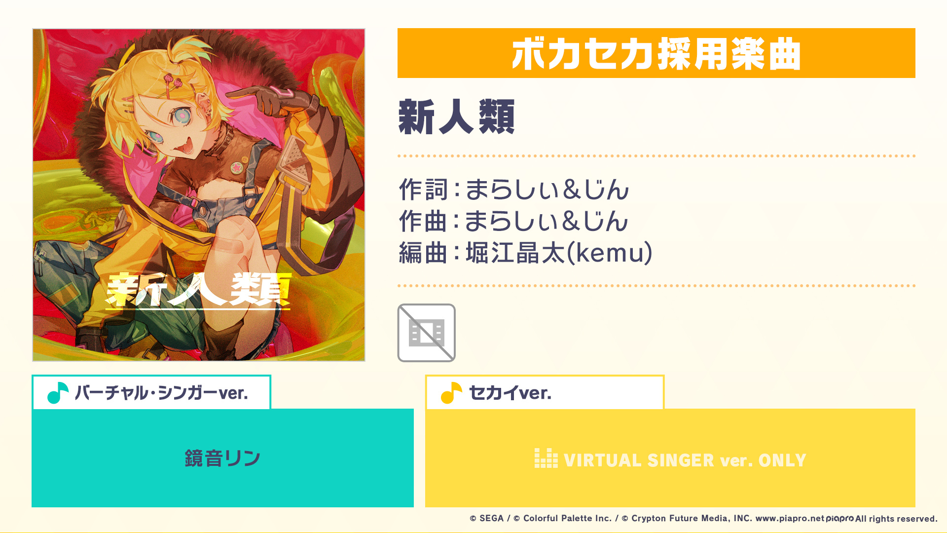 「ボカコレ 2023 春」与《世界計畫》合作企划「ボカセカ」的採用作品「新人类」(作詞・作曲:まらしぃ&じん)、「ずんだパーリナイ」(作詞・作曲:なみぐる),決定加入遊戲中成为节奏遊戲乐曲。