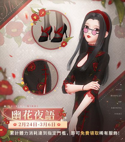 此次游戏更新后至3月6日,限时服饰福利活动「幽花夜语」上线。 活动期间,玩家体力消耗达到指定要求,可免费获得稀有服饰「幽花夜语」。 绣满了娇花的丝绮和拼接的黑纱相映衬,就像在黑夜里展翅欲飞的蝶,复古与时尚完美结合。