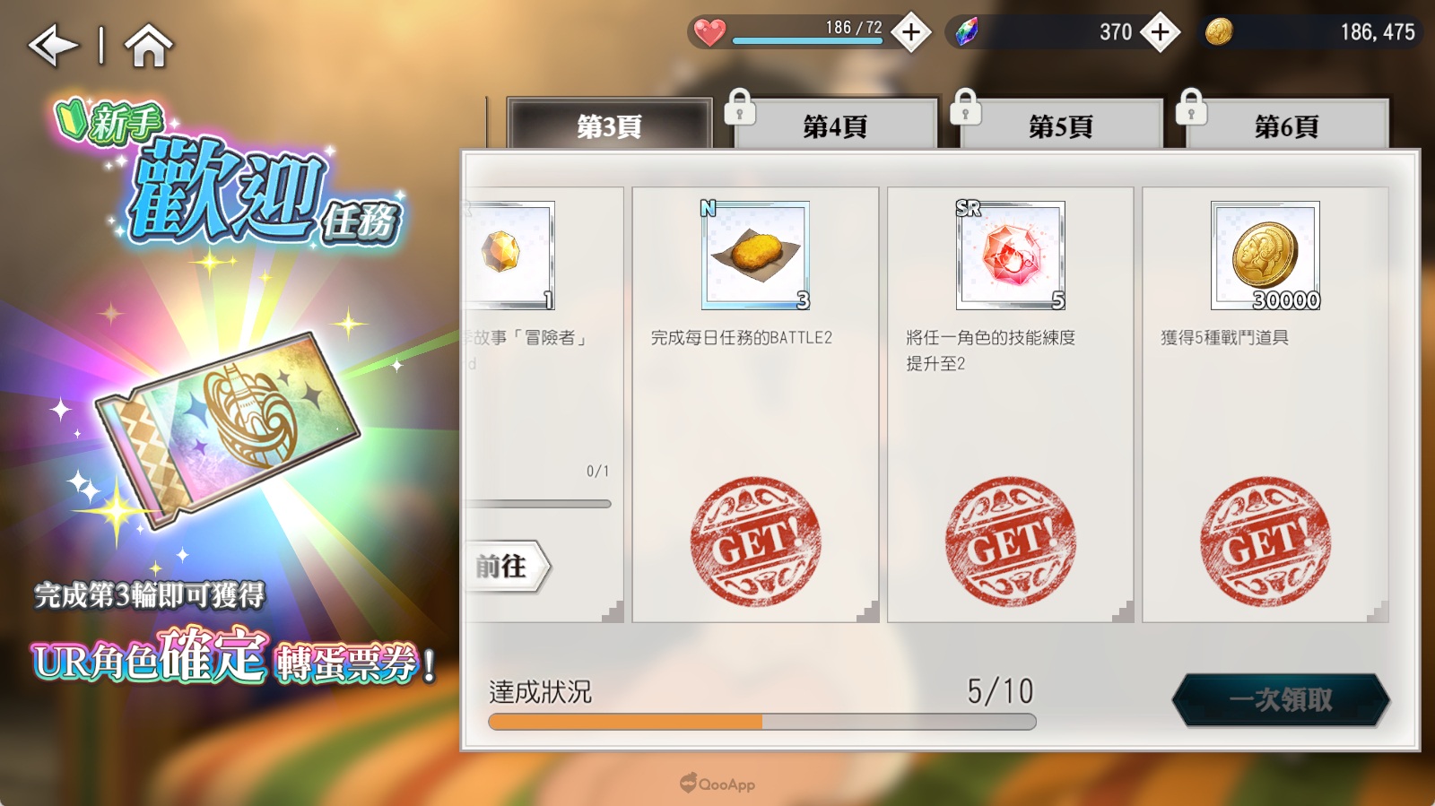 新手欢迎任务不用多说,除了丰富的经验石、魔宝石,完成第 3 页的任务还有必得 UR 角色的转蛋券。 如果主线故事推到卡关可以回到这边解任务拿资源。