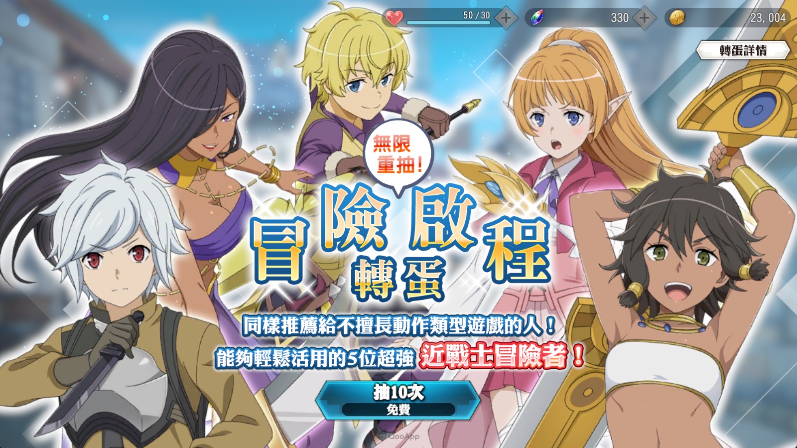 本作在完成开局故事「第四话 因为是伤员」引导后,会来到可无限重抽的「冒险启程转蛋」。 前1~9抽获得UR角色的机率为3%(冒险者、支持者各占1.5%),第10抽则可从UR贝尔、蕾菲亚、蒂奥娜、阿伊莎、芬恩等5名冒险者中必得1名。