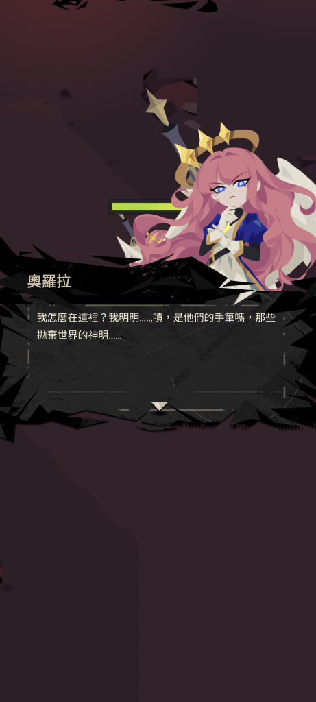 在剧情方面,本作以克苏鲁神话式的系统为主轴,并混合了其他形式的科幻与奇幻题材,讲述作为前天使长的主角在最终之战后被无序之神选中,穿梭在混乱时空讨伐敌人,并与其他人相识的故事。 虽然整体的文本量不算多,但凭借着角色的背景故事、关卡说明、与NPC的互动等等,都能让玩家感受到世界观的趣味性。 比较可惜的地方是,本作中的叙事较为破碎,加上作为主要叙事手段的角色剧情并不容易解锁,就让剧情元素有些影薄,但考虑到幸存者游戏本来就不以此见长,倒也不算是太大的问题。