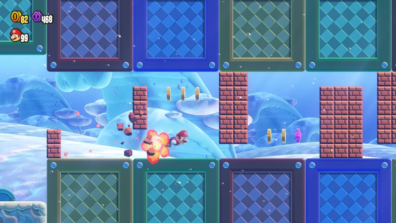 关卡中的咬咬除了会攻击玩家也会吃掉金币或宝物,要在他们吃掉惊奇花之前赶紧触碰。 触碰后进入异世界,左方会出现整面墙的咬咬,手拿POW炸弹可以暂时停止他们的动作,抵达终点后就能获得2颗种子。