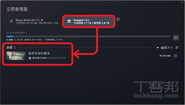步骤12. 点击上方分页切换到另一颗硬盘,就能看见游戏已经被顺利转移,若想将游戏搬迁回原本的硬盘,只要重复相同步骤即可。