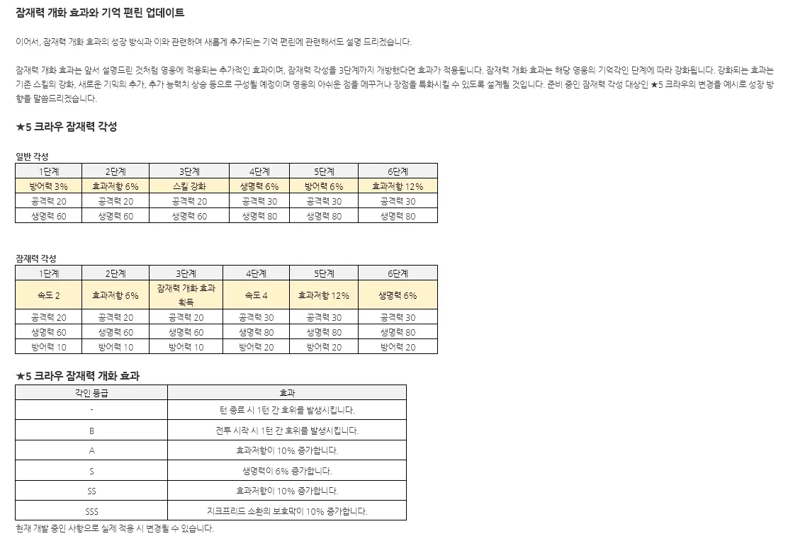 「潜力觉醒」为韩版原本预定自 9 日起更新上架的新功能,据开发团队表示,这个潜力觉醒系统是团队特别针对角色平衡而设计新功能,透过这个系统,能让玩家平常少用或觉得难用的冷门角色,也能藉此重新翻身成为玩家队伍的宠儿,也让英雄的培育养成更具变化。