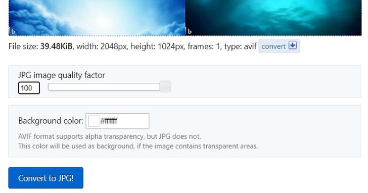 步骤 4. AVIF 文件上传后,向下卷动网页,将图像质量的滑杆拉到「100」,然后按下「Convert to JPG」。