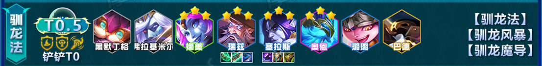 上图只是驯龙体系的一套阵容 ,驯龙体系后期变阵较多,大多数法系棋子均可充当主C。