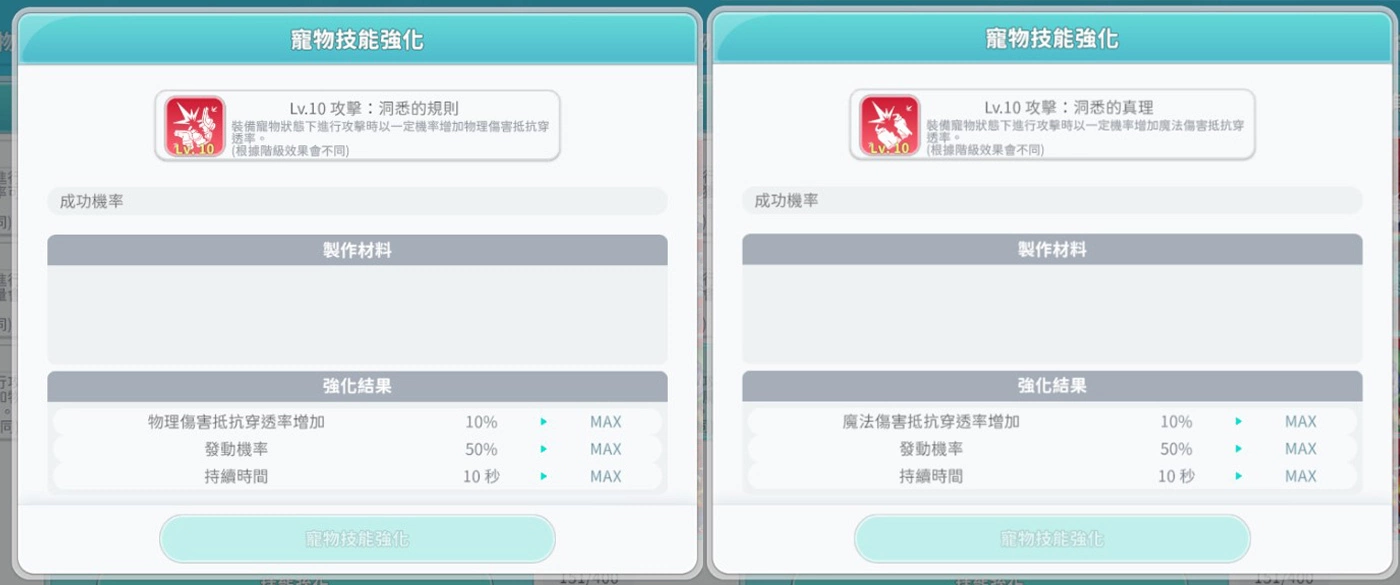 除了神兽系列外,其它遗物阶级宠物将拥有第三条属性,并且还新增了第三个遗物技能,虽然神兽系列没有第三条属性,但是却增加了更强的遗物技能,分别是「物理伤害抵抗穿透率增加」以及「魔法伤害抵抗穿透率增加」,而等级升至最高级的话可再额外增加 10% 的效果,是非常强大的技能。